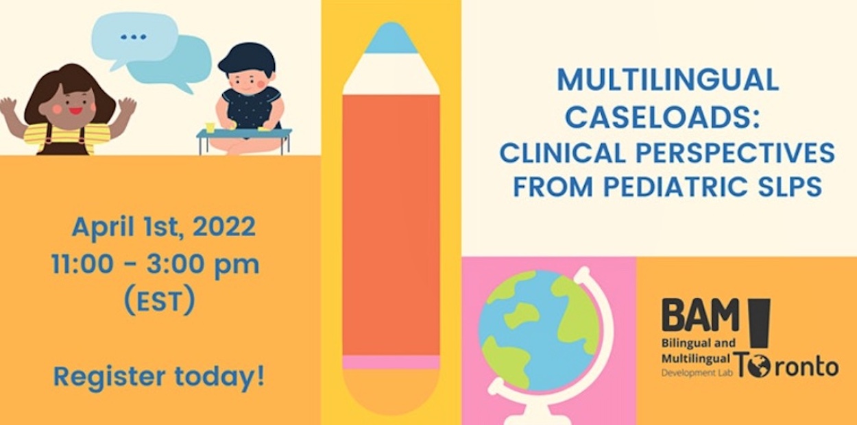 The Bilingualism & Multilingualism Development (BAM!TO) Lab is offering an online workshop and roundtable discussion on Friday, April 1st (8:00am - 11:00am PST) that will focus on speech language pathologists’ perspectives on providing assessment and intervention for multilingual children in Canada and future areas of research in the provision of multilingual pediatric SLP services.